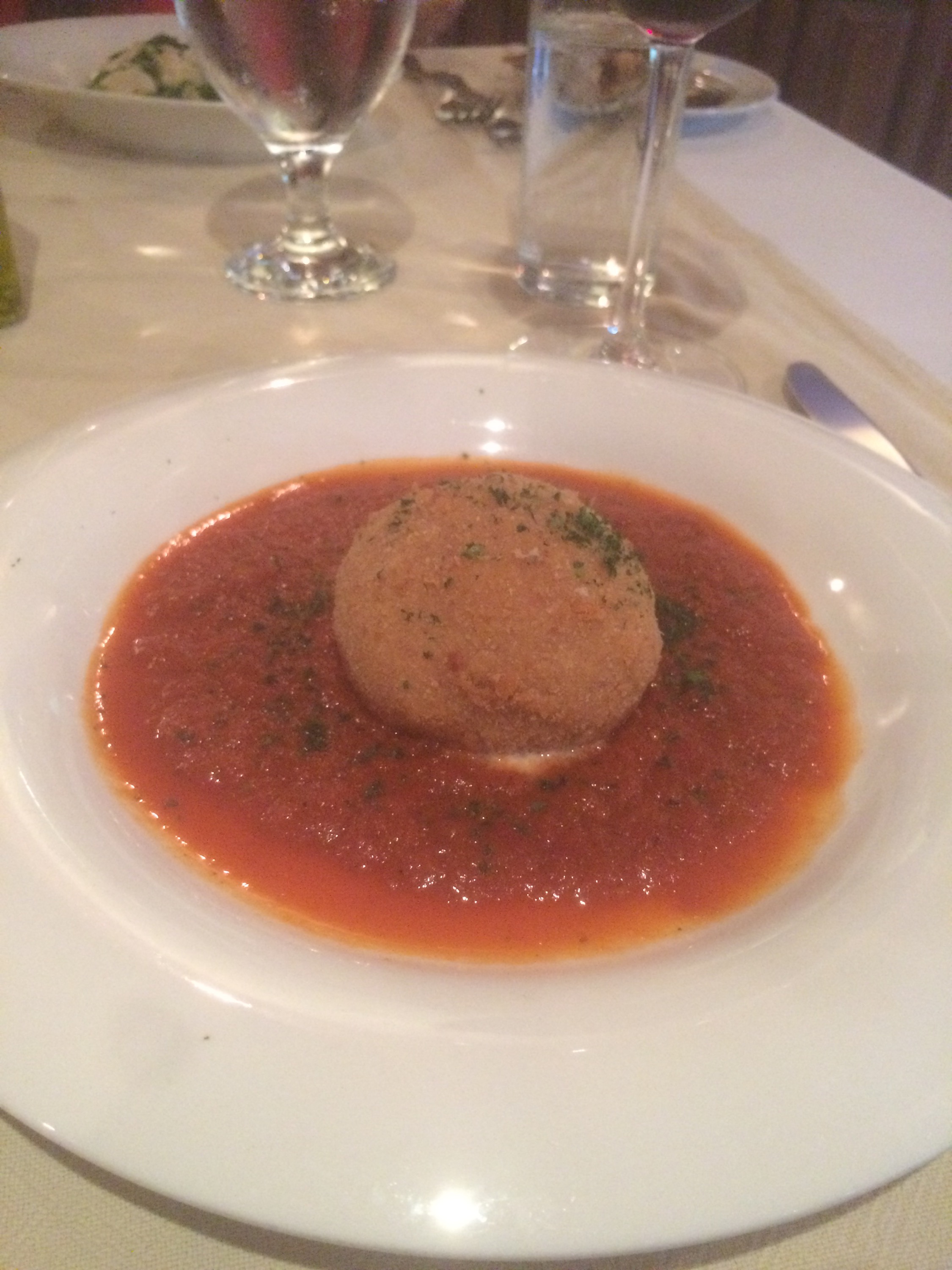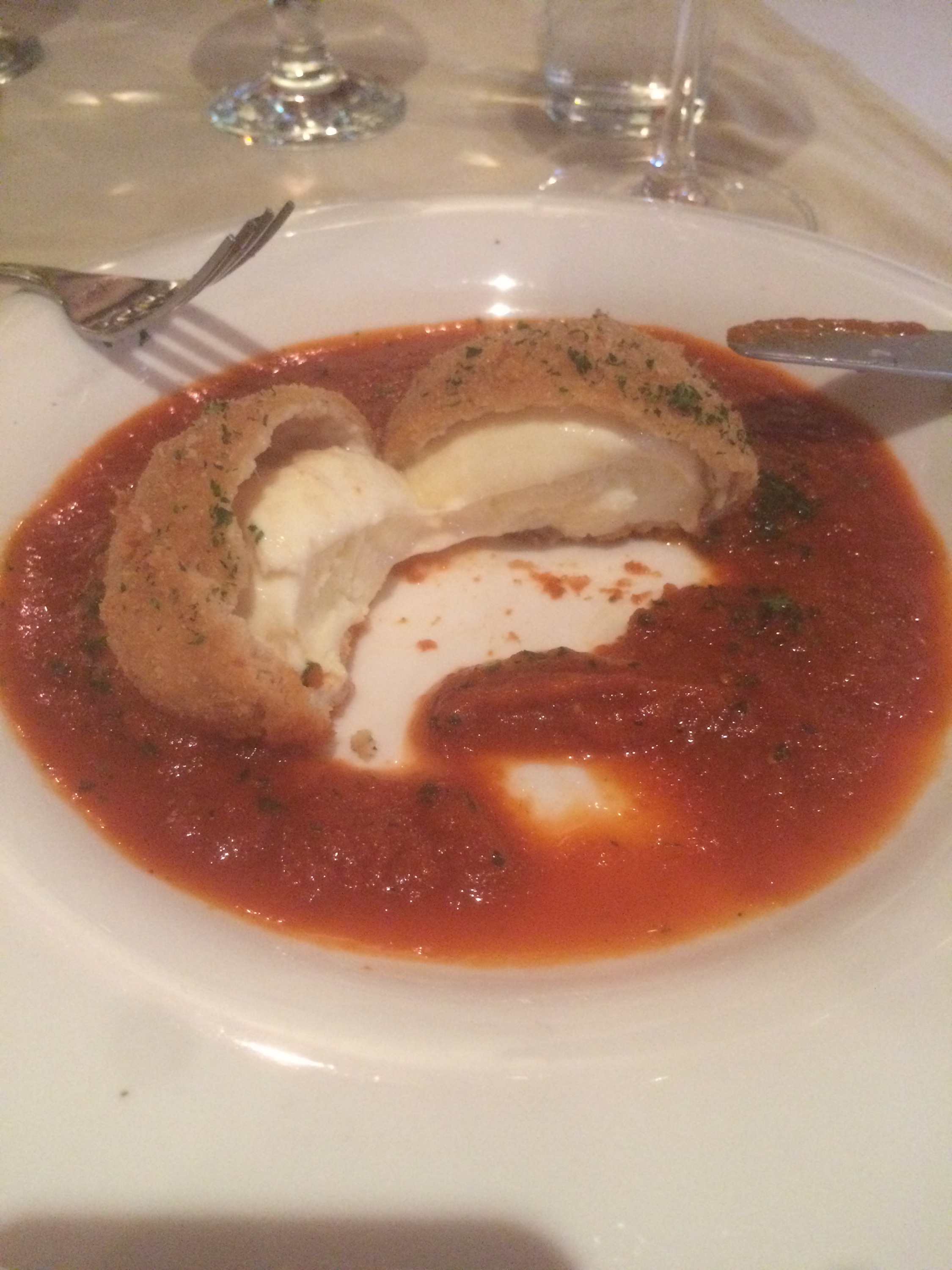 Mozzarella in Carrozza, un plato típico del sur italiano, hoy en día presente en todo el territorio y en la mayoría de los restaurantes de esta cultura; una textura firme en el exterior y que al cortarse se obtiene la suavidad y frescura de la Mozzarella di Búfala, con una pasta de tomate y albahaca que hace al comensal olvidarse de los asuntos mundanos y disfrutar de algo tan sabroso que merece aplaudir al chef.
