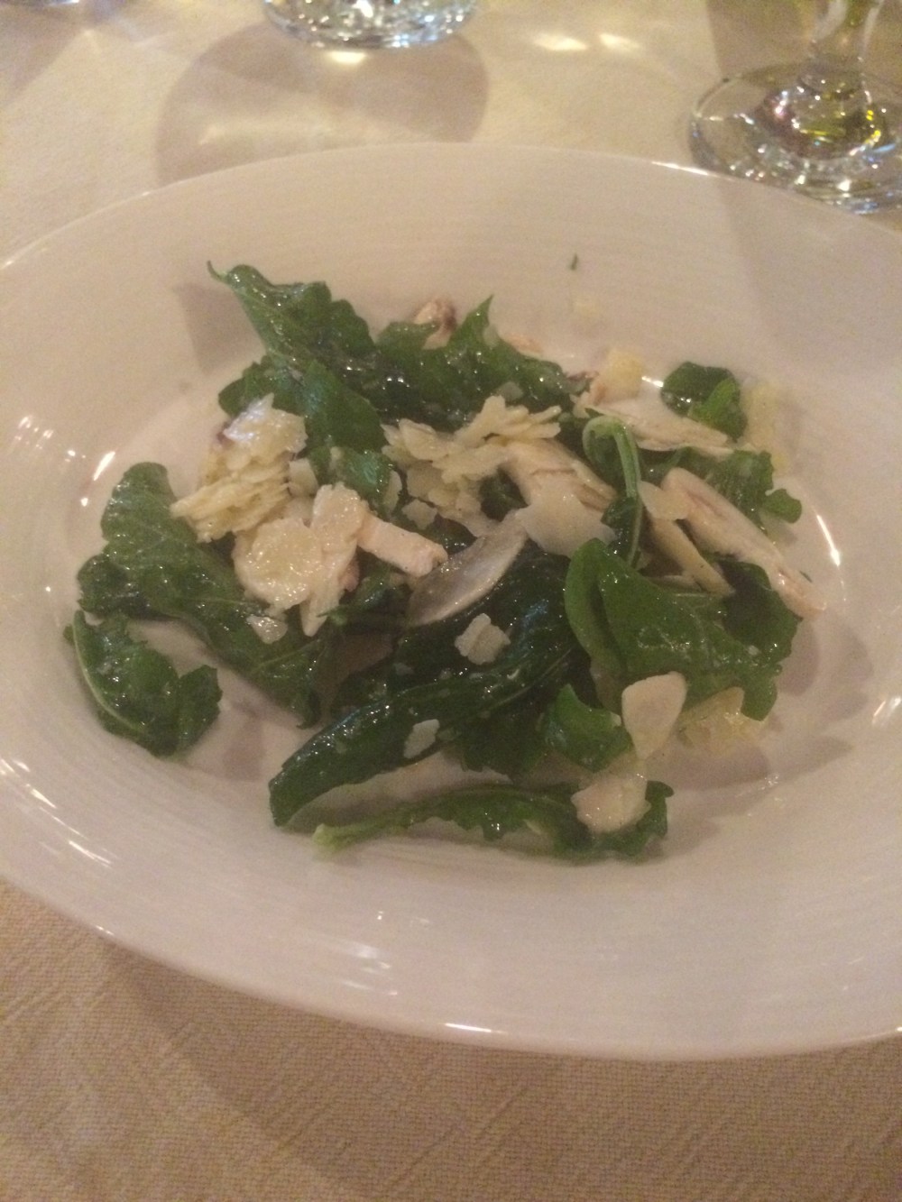 Ensalada de Hongos, otra de las opciones de entrada en el menú de almuerzo, también disponible en el servicio nocturno. Arúgula y Parmesano, Hongos, Limón y Aceite de Oliva.