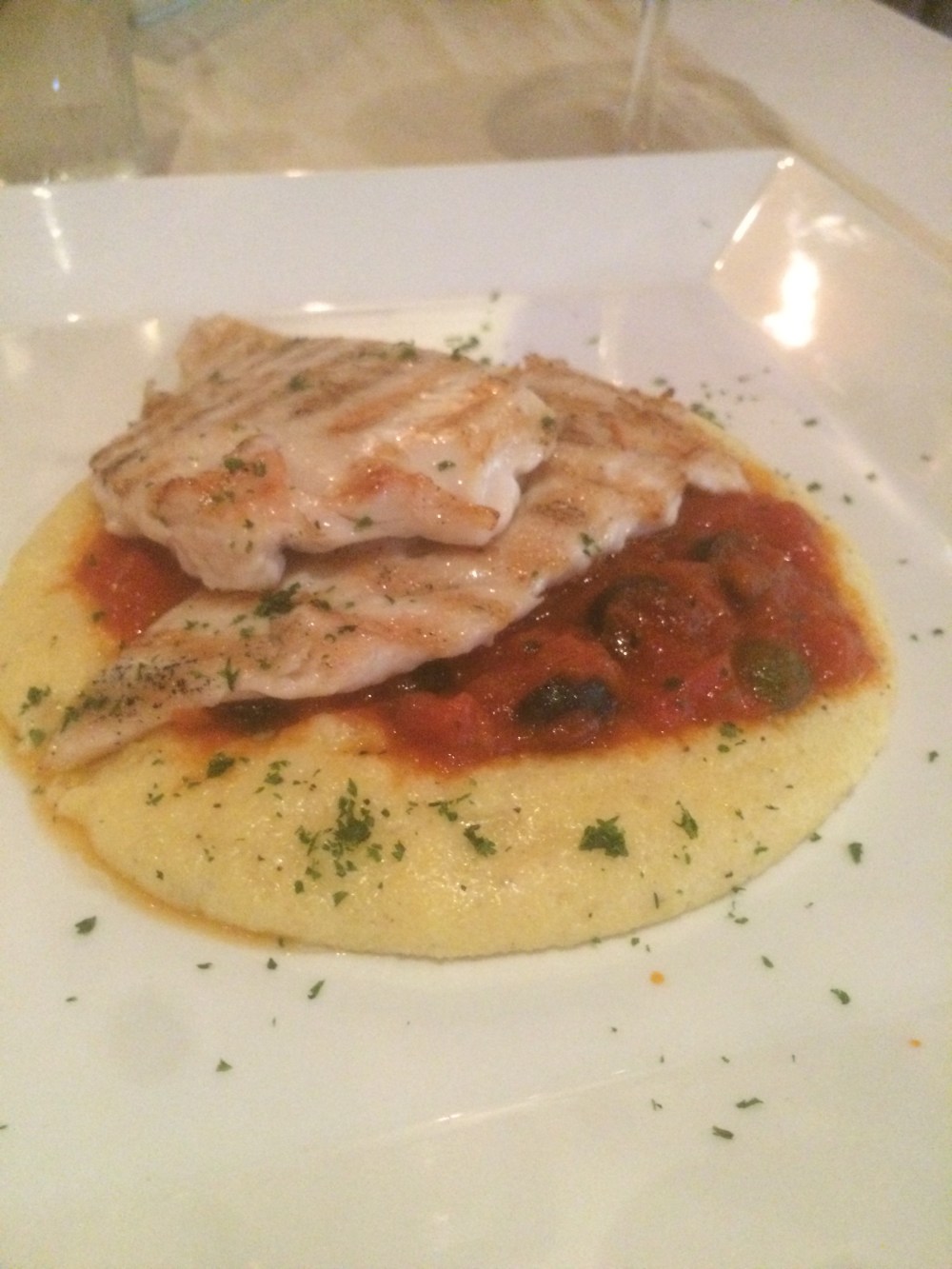 Pollo Grillado a la Siciliana, una pechuga de pollo cuidadosamente colocada en dos partes iguales sobre un cama de polenta cremosa con alcaparras y aceitunas.