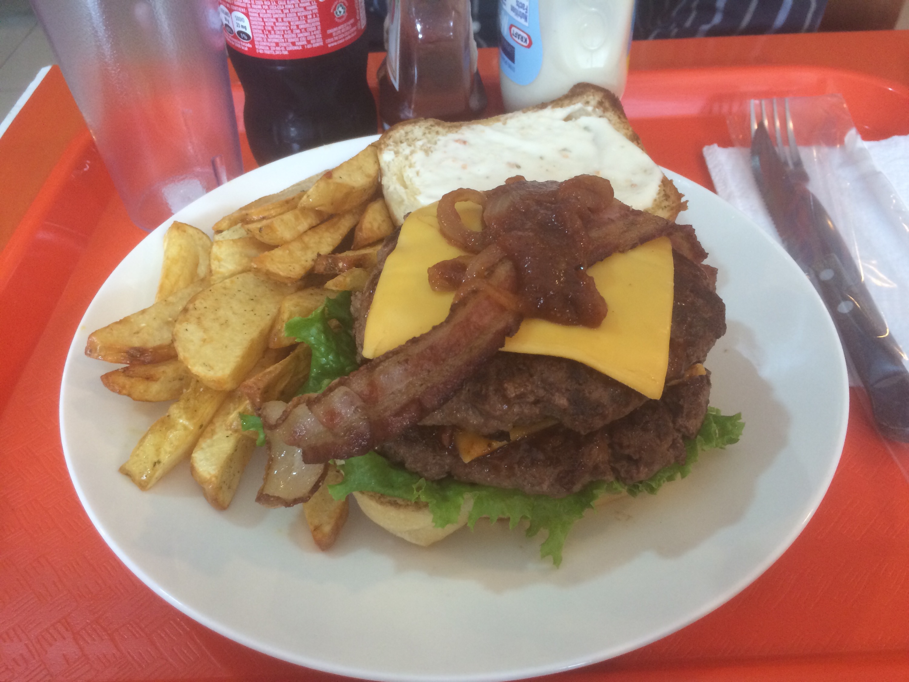 Igualmente tienen hamburguesas de una libra de carne dividida en dos tortas acompañadas de doble queso, tocineta, tomate, cebolla, lechuga y una guarnición de papas oriundas de Cartago.