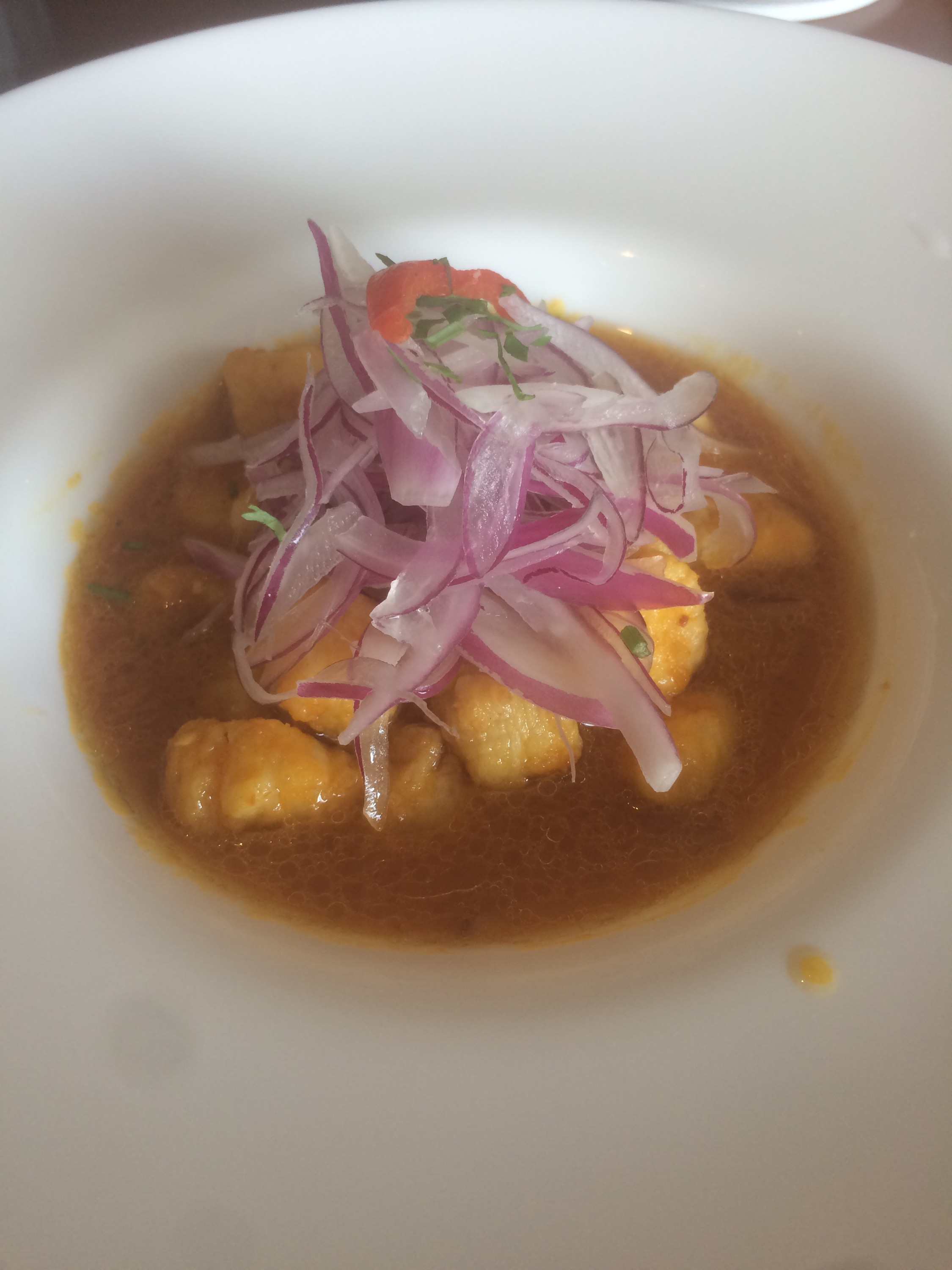 Trozos de corvina empanizados y freídos en una crema de ají que con un leve picante regala un sabor intenso y lleno de frescura, rematando con las cebollas moradas en su cumbre.