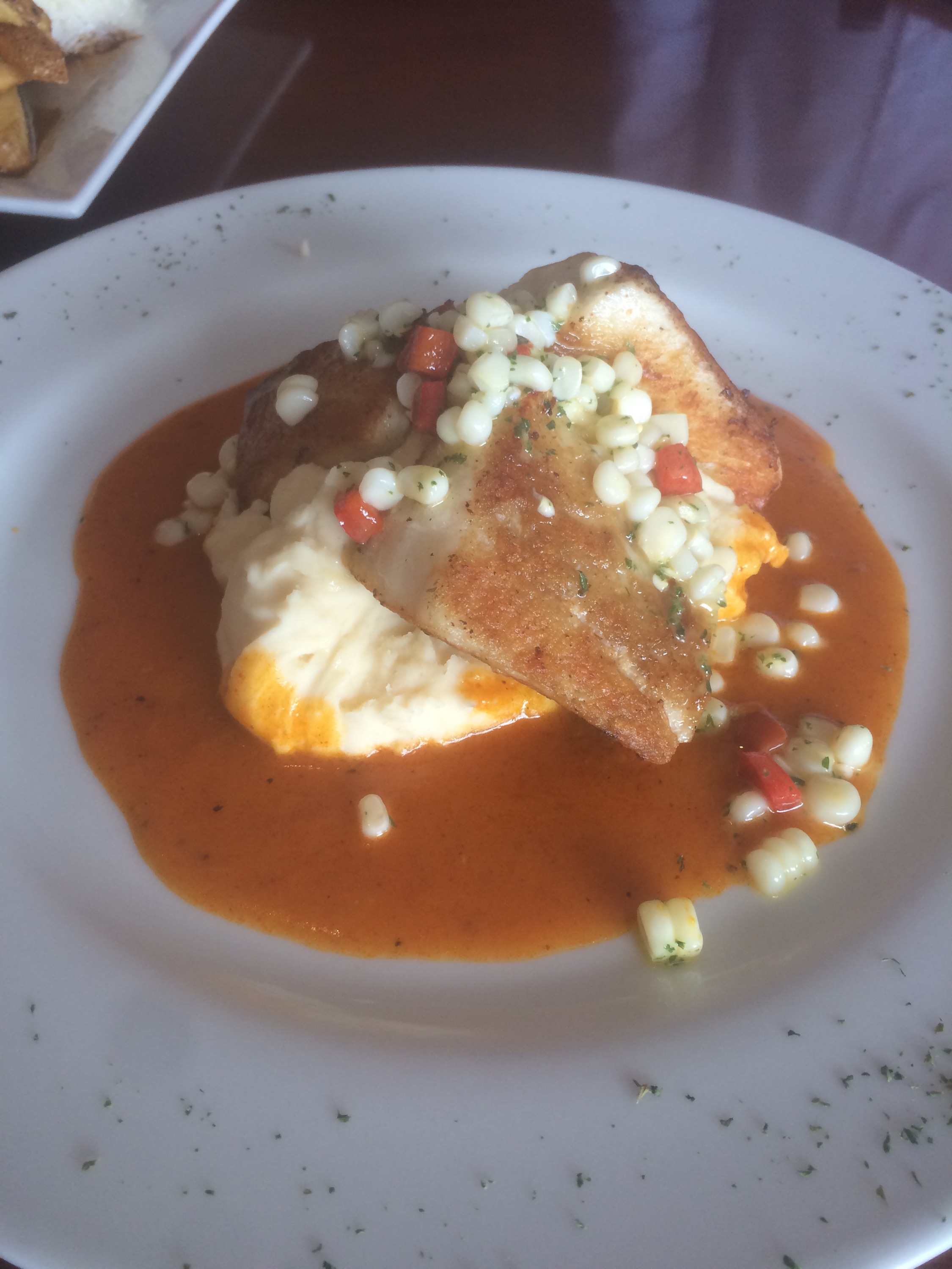 Tres jugosos filetes de Corvina a la plancha, montados sobre un Puré de Pallares, los Pallares son una especie de frijoles de gran tamaño que crecen en la zona costera de Lima. De ahí se explica su nombre y el acompañarse de una crema de ají levemente picante con poco de maíz aliñado fueron el cierre magnífico por la combinación de sabores y texturas.