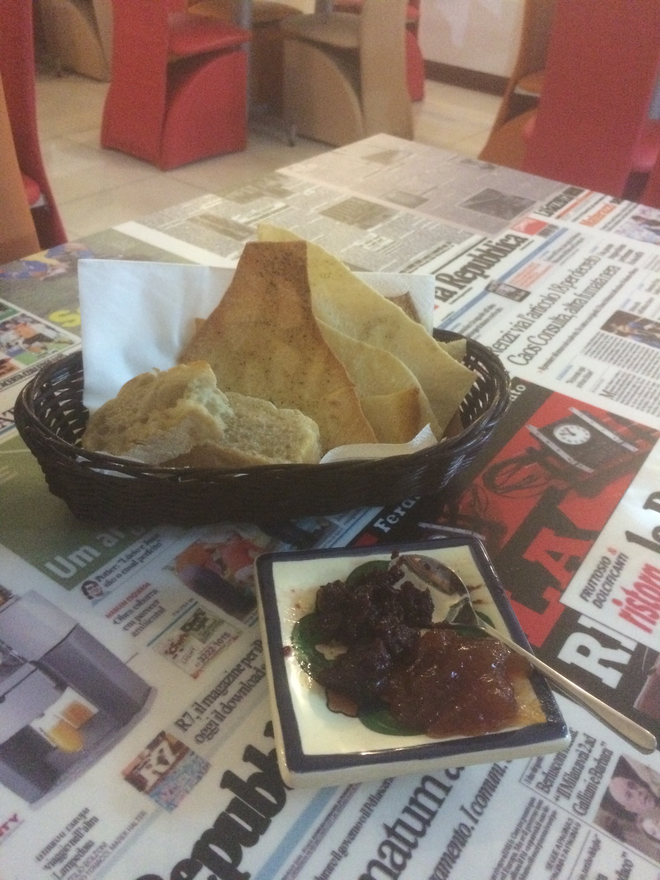 Recibiendo la bienvenida típica de un restaurante de este nivel, con un pan fresco y esponjoso para disfrutarlo con un aceite de oliva extravirgen. Tambien en esa misma cortesía de la casa venía con el Pan Carasau, y unas deliciosas mermeladas de ciruelas y manzanas, tanto el pan como las conservas son importadas por parte de Bottega Italiana junto con un selecto grupo reconocidas marcas de vinos y licores.