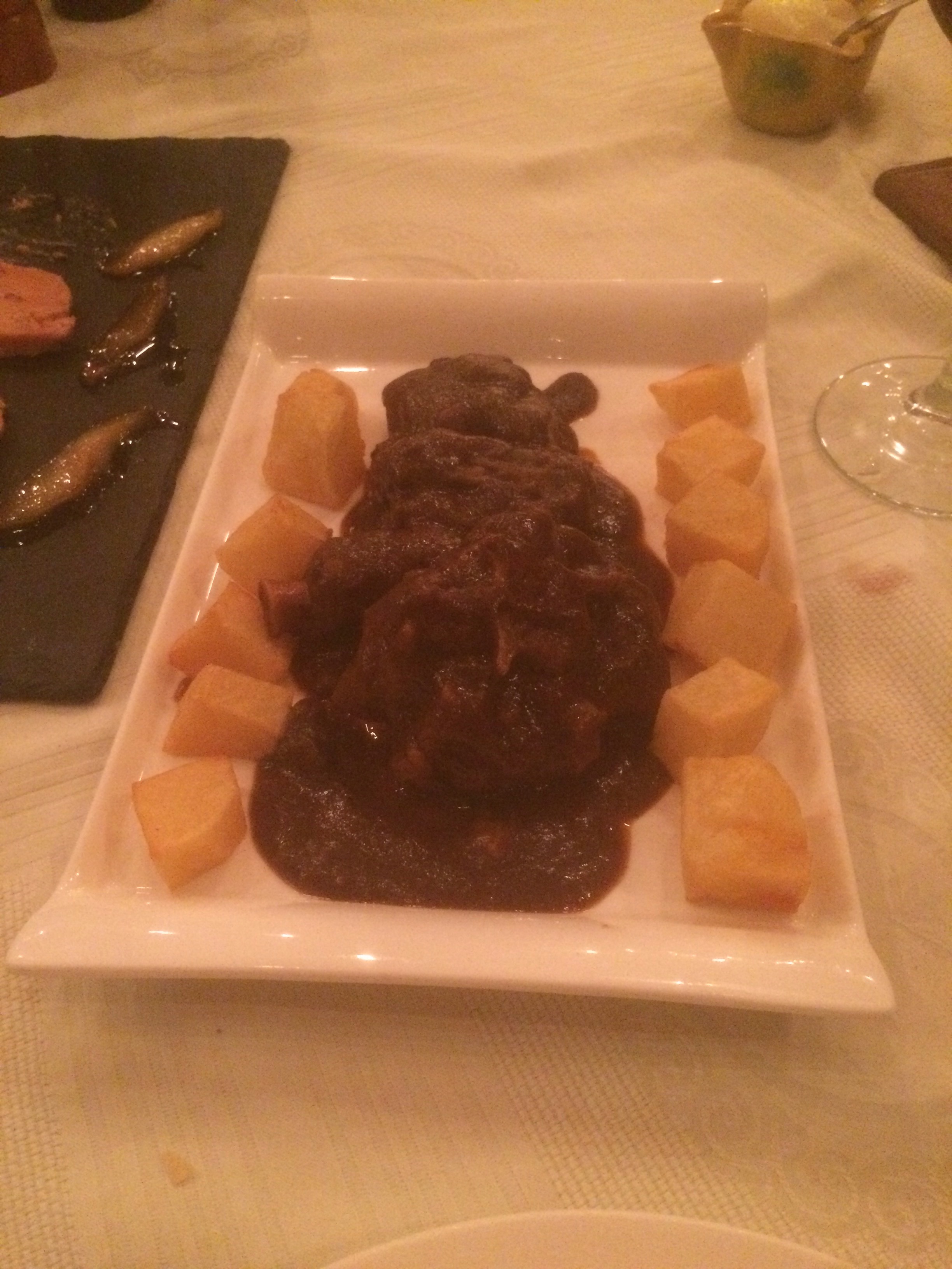 El Rabo de Toro es una carne de singular suavidad, a diferencia de otros cortes, y para la preparación de la salsa fueron necesarios seis litros de vino y seis horas de cocción a fuego medio para poder obtener la textura melosa que proviene del colágeno del hueso. Un sabor entre lo sublime y lo mágico que al mezclarse con las papas recién hechas, daban una combinación de texturas sumamente interesante.