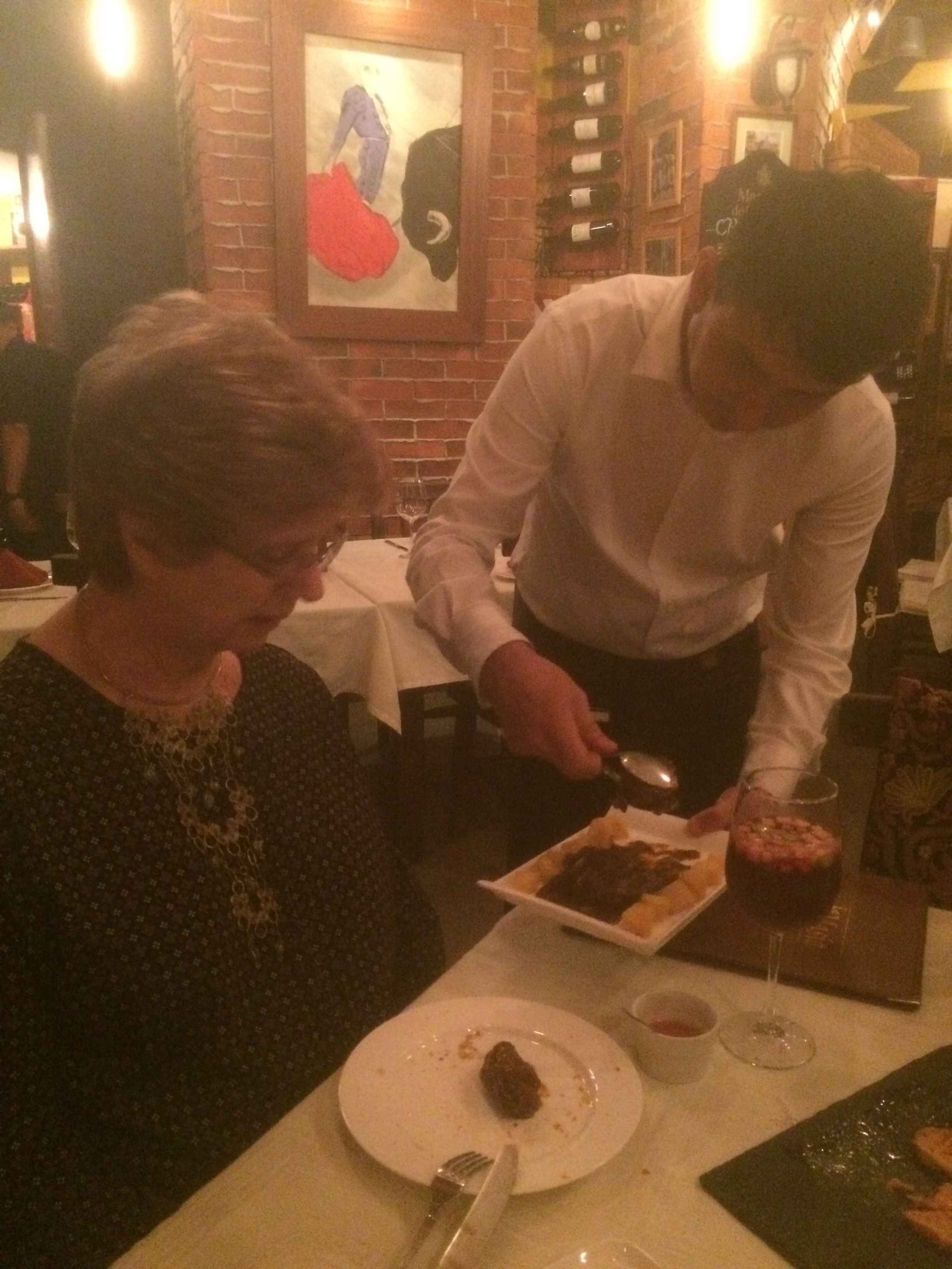 La Tira de Asado era una carta bajo la manga del chef, partiendo del argentinísimo Asado de Tira, le ha evolucionado haciendo una reducción de Vinagre Balsámico durante veinticuatro horas, obteniendo de dicha carne una sensación de extrema suavidad mientras se percibían los ligeros tintes del Balsámico y de cebolla caramelizada. La carne sencillamente espectacular, acompañada de un Pimiento de Piquillo y unas papas al horno dieron al paladar el sentir de algo bien logrado; parecería muy limitada la ración pero cuando tenemos un servicio de cinco o más platos, esa más bien esa medida la indicada.