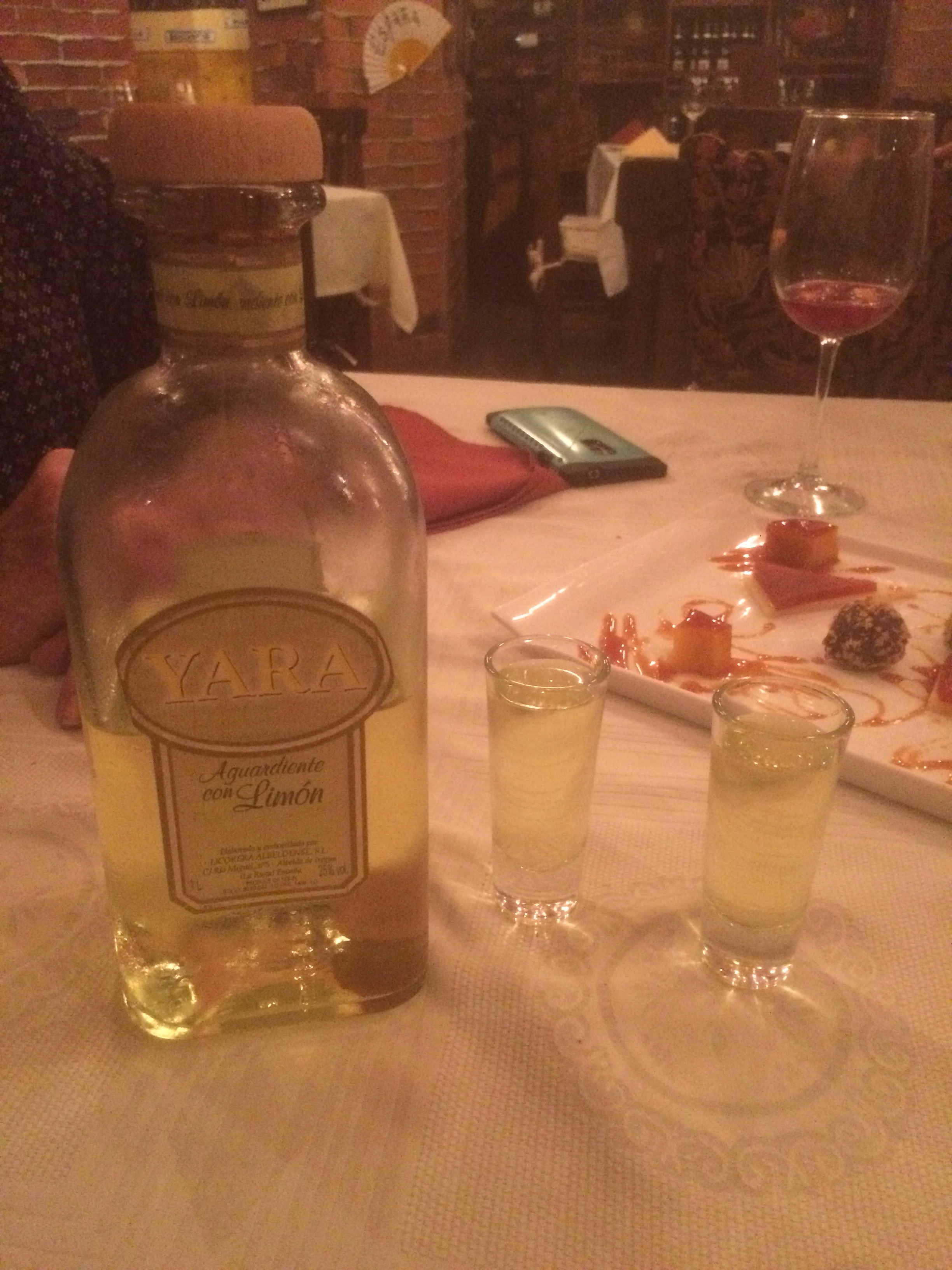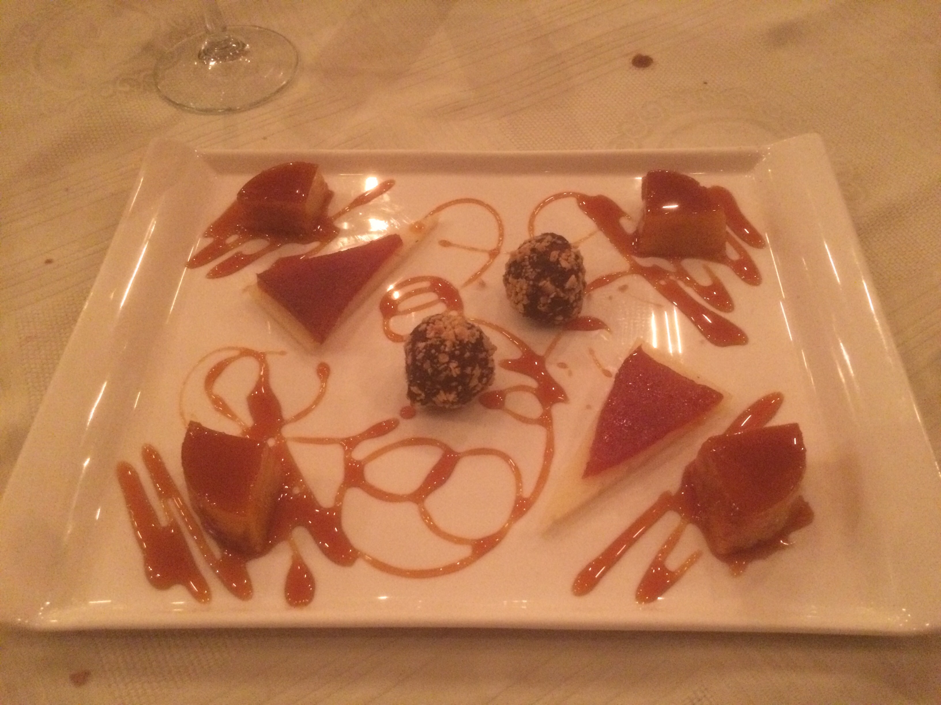 El quinto plato de la noche, llegó para hacer un cierre espectacular. Acorde con las nuevas tendencias el mezclar dulce con salado en un postre se ha vuelto algo usual, de ese modo es ver común las lonjas de queso manchego con láminas de membrillo. Acompañado de una salsa del mismo membrillo, el Tocino del Cielo con su fuerte sabor dulce esgrimía un final de memorables recuerdos, y por supuesto unas trufas de buen chocolate amargo, son para dejar en jaque mate a cualquiera con este postre y después de haber disfrutado los cuatro platos anteriores. Y el zarpe final de un buen digestivo, hizo el último de los deleites de la noche.