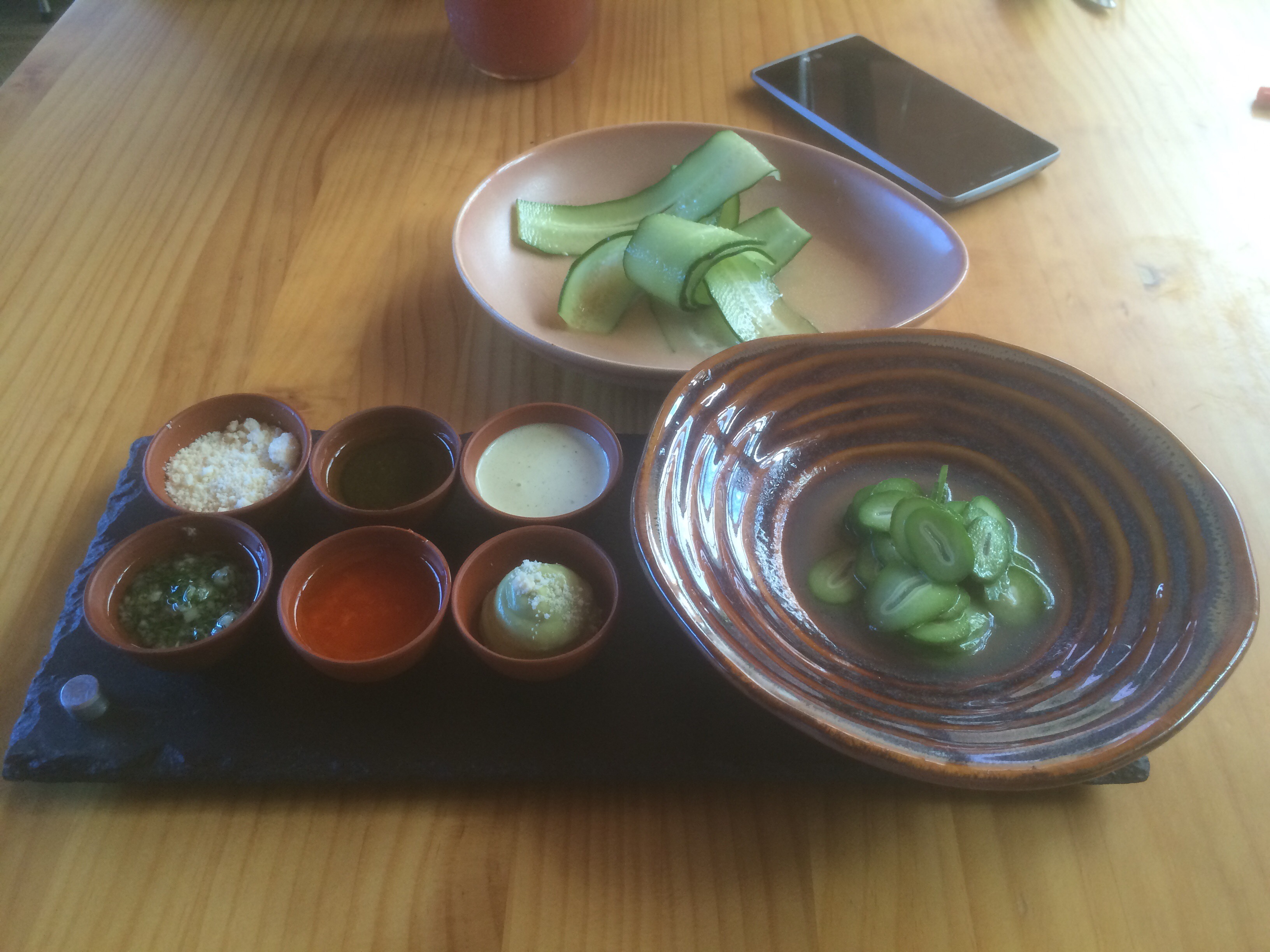 Una elegante bandeja con seis recipientes, con un Queso Bagaces, también Pesto con Albahaca y un Chimichurri, no podía faltar el Chile Panameño, una interesante Mayonesa de Cebollinos y el más destacado de todos, un cremoso de aguacate.