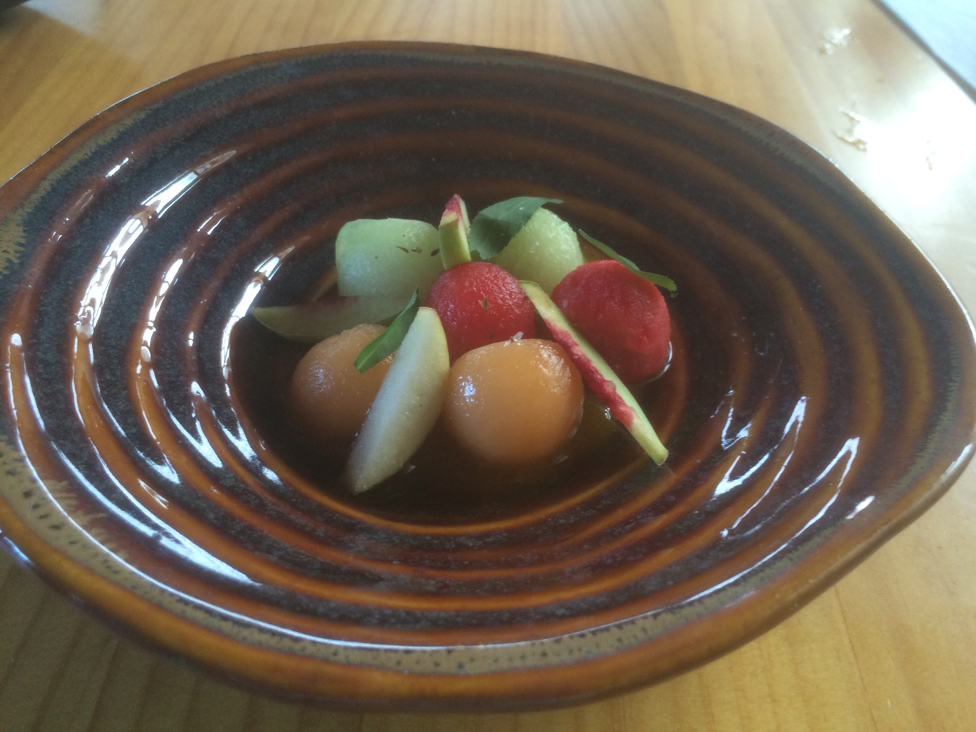 Tremenda combinación de sabores y texturas, los jugosos melones de temporada con los duraznos secos con tintes cítricos en una miel casera de Naranjilla. Impresionante