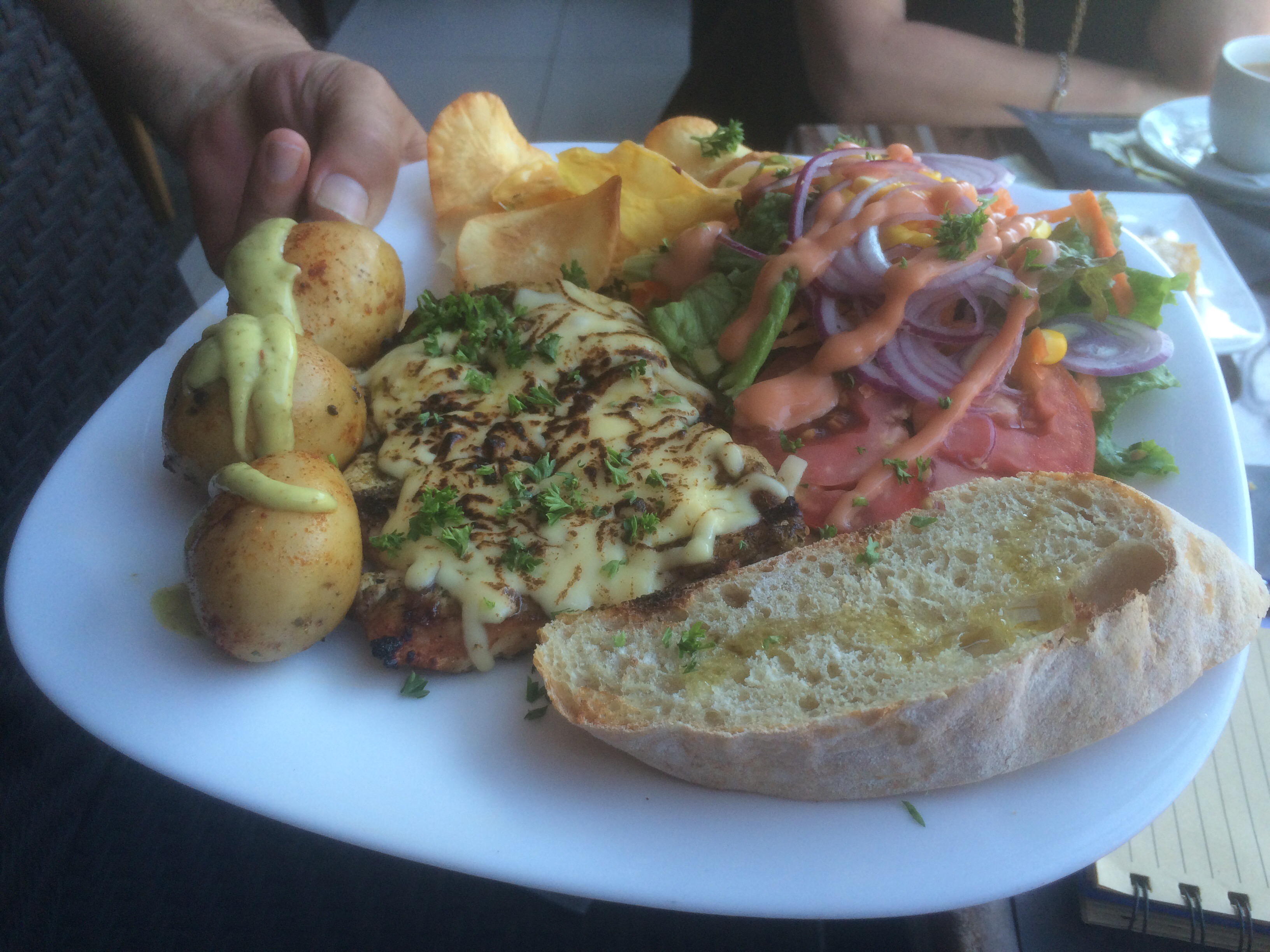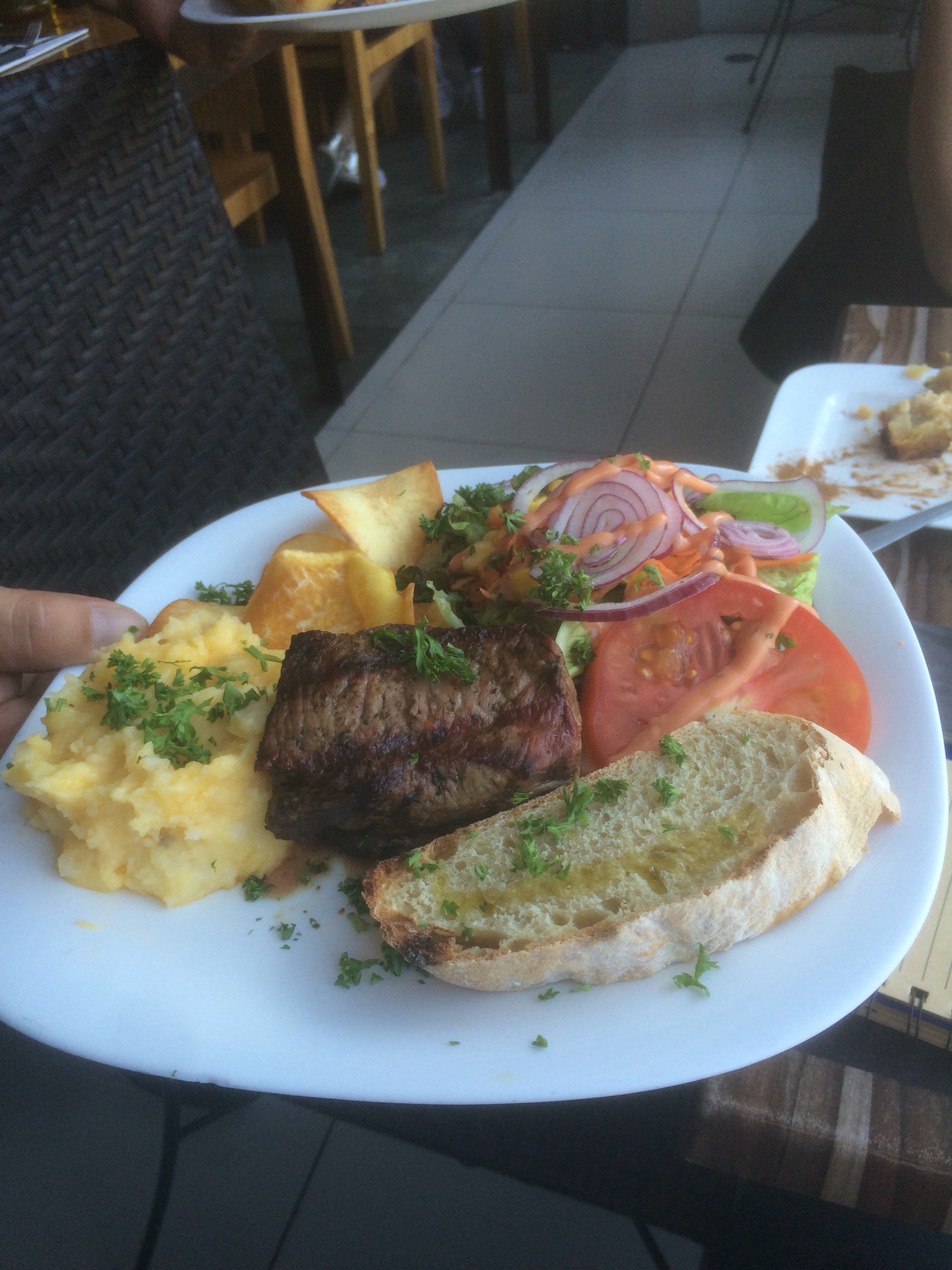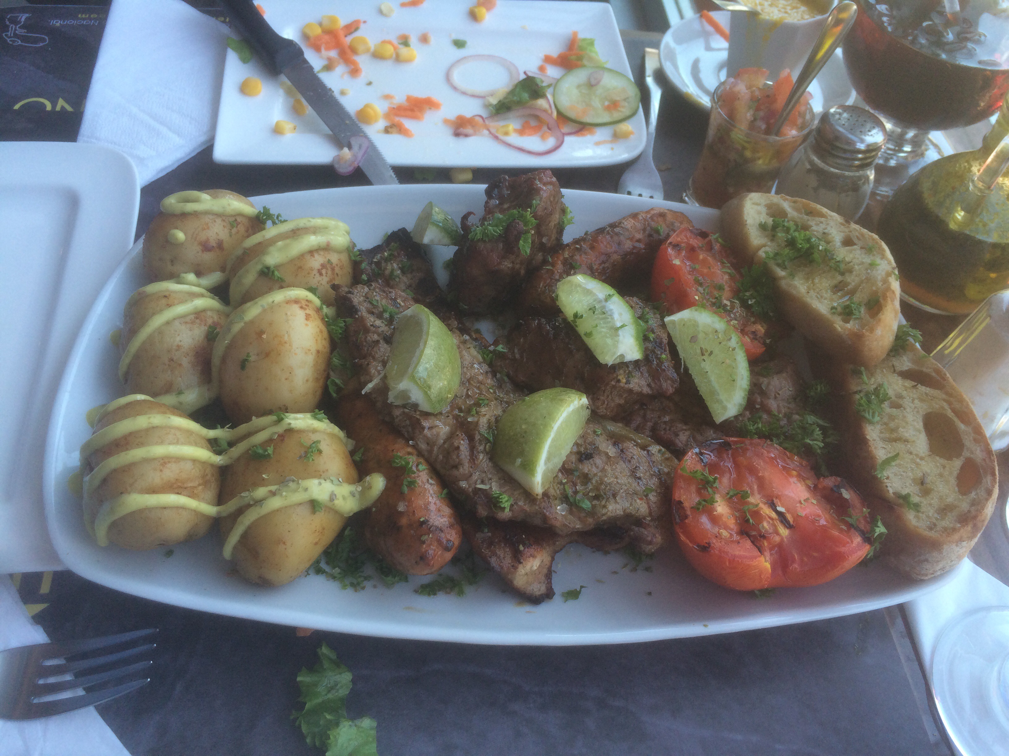 Papas a la parrilla, tomates asados, unos focaccia con aceite de oliva como guarniciones de unos chorizos y costillas de cerdo (no llegué yo a probarlos, pero mi acompañante los devoró en un abrir y cerrar de ojos), además del cerdo, habían dos cortes de Vacío y dos cortes de Entrecot, dichos cortes fueron de una suavidad dichas carnes, que la reacción de asombro no se hizo esperar.