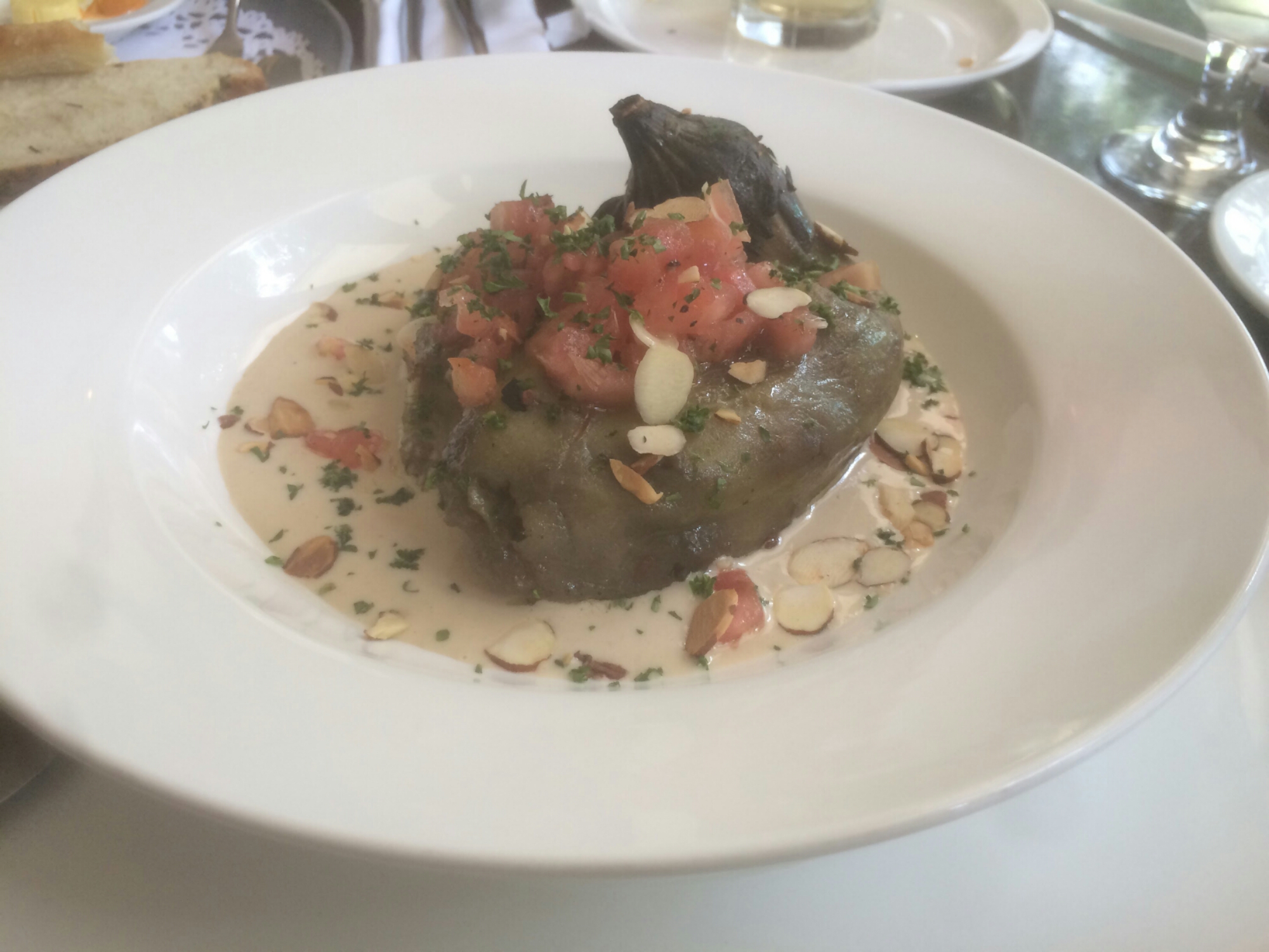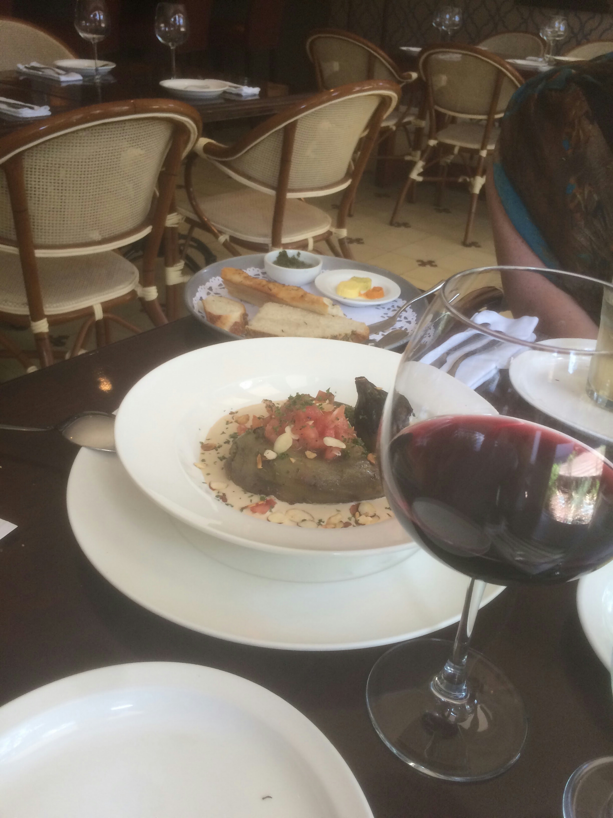 Berenjena a la Parrilla: Berenjena cocida en forma entera a la parrilla y posteriormente servida en una cama de Tjina con almendras, perejil y tomate. Para quienes son dados a consumir la berenjena, este plato es un completo éxtasis.