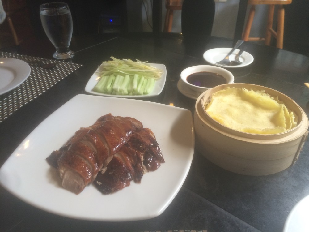 Una carne suave, cocinada con la piel que tenía una textura crocante y cortado en lonjas para ser consumida entre las tortillas típicas hechas a base de harina y huevo, aderezados con una Salsa de Ciruelas. Acompañadas de finos cortes de cebollino y pepinos daban toda una experiencia .