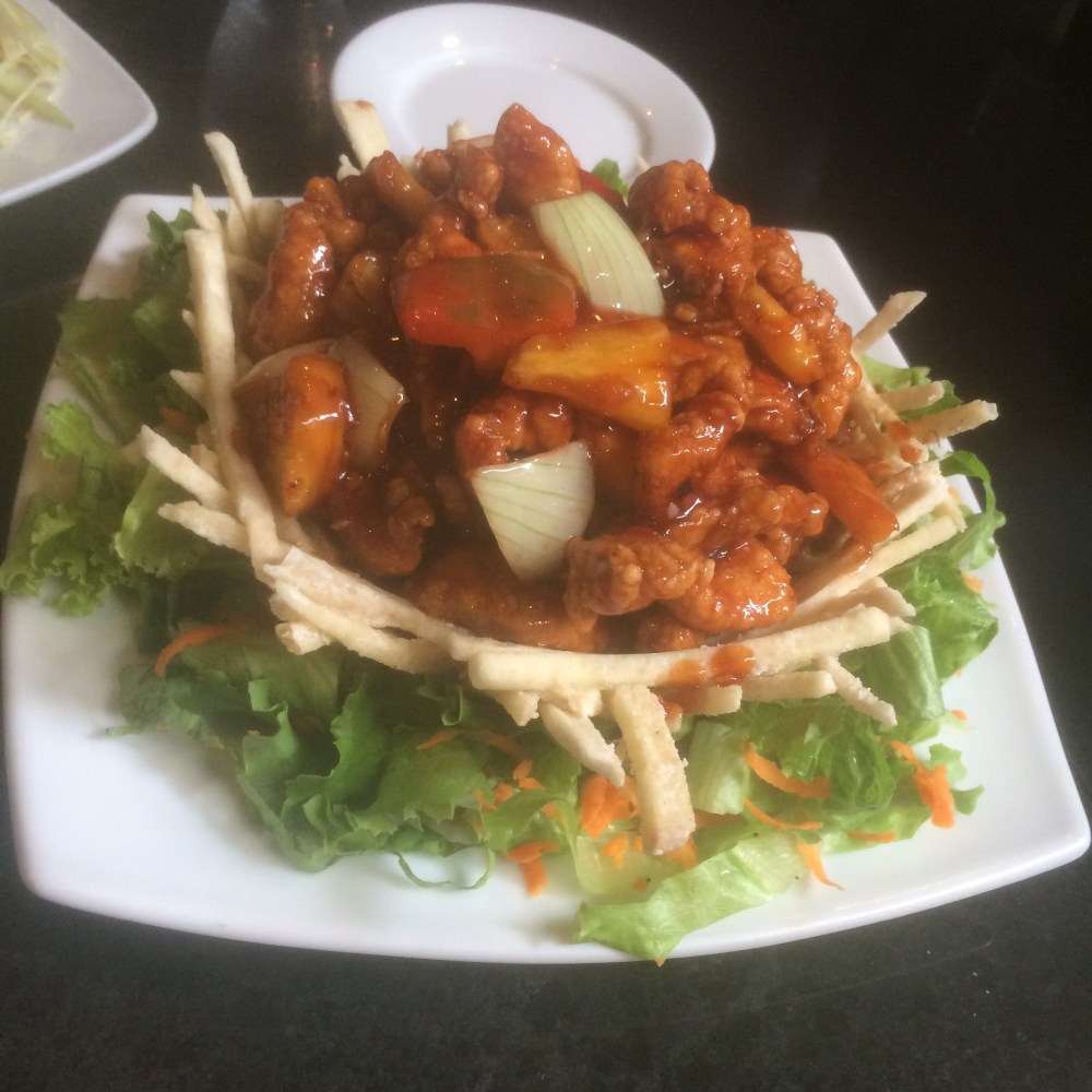 Pollo en su Nido: Una canasta de Ñame sobre una cama de lechugas traía su mejor muestra de una salsa agridulce con ligeros toques de naranja, que acentuaban a un ligero sabor ácido y exquisito, con el dulzor de una salsa muy bien lograda para que cada ingrediente de este plato se convirtiese un manjar inolvidable.