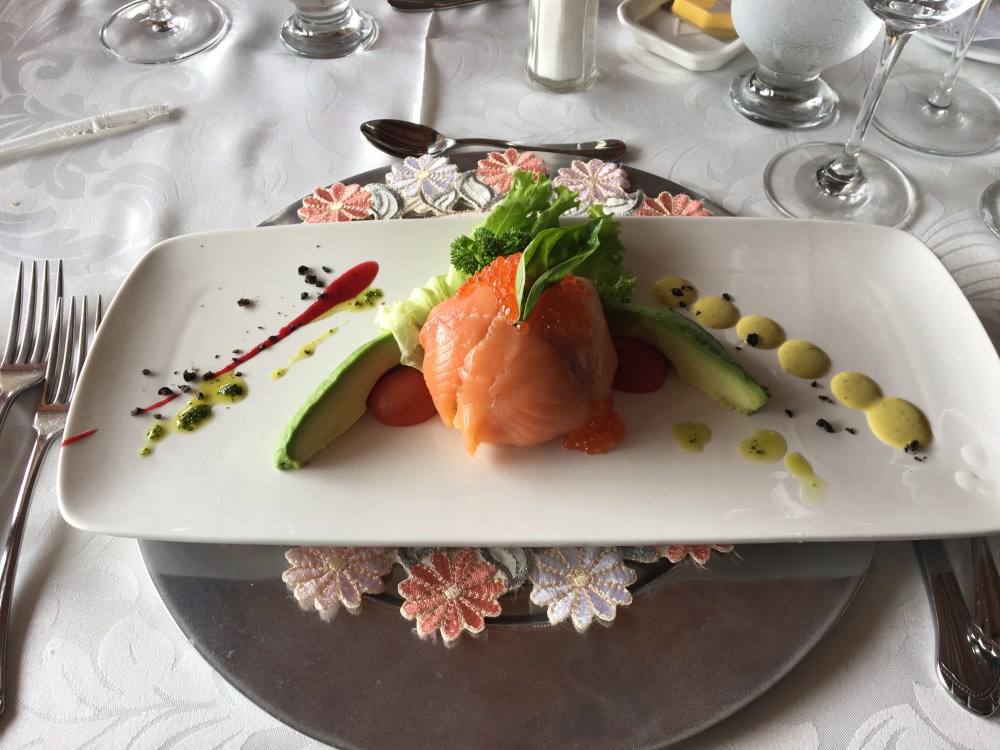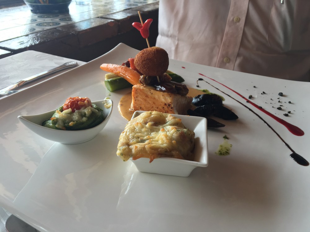 Bombón de Tartar de Salmón: Para los amantes del Salmón este es un plato que enloquece hasta el más ecuánime. Tres texturas diferentes para el deleite de esta entrada fría. Caviar de Salmón en la cúspide de un Salmón ahumado que envolvía un Tartar de Salmón con pequeñas tiras de manzana Granny Smith y su respectiva vinagreta de manzana Washington. Somos pocos quienes hemos llegado a tener la dicha de encontrar y saborear algo tan único y bien logrado.
