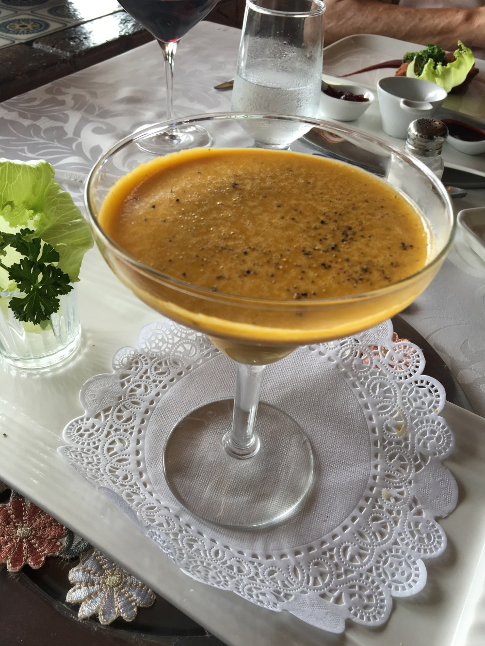 Crema de Peiibaye: Una de las mejores propuestas que Claudio nos comparte, entre su amor por Costa Rica que ha adoptado como su patria y sus habilidades en la cocina, logrando una crema de textura ligera y sabor intenso, elegantemente servido en copa de Margarita, con un retoque de pimienta fresca para acentuar aún más el sabor.