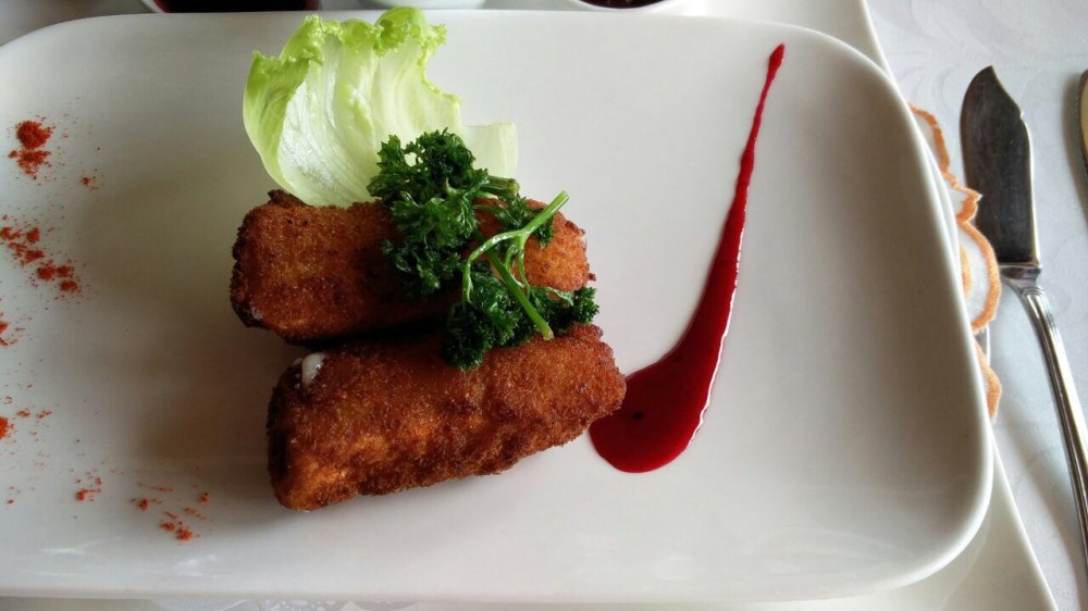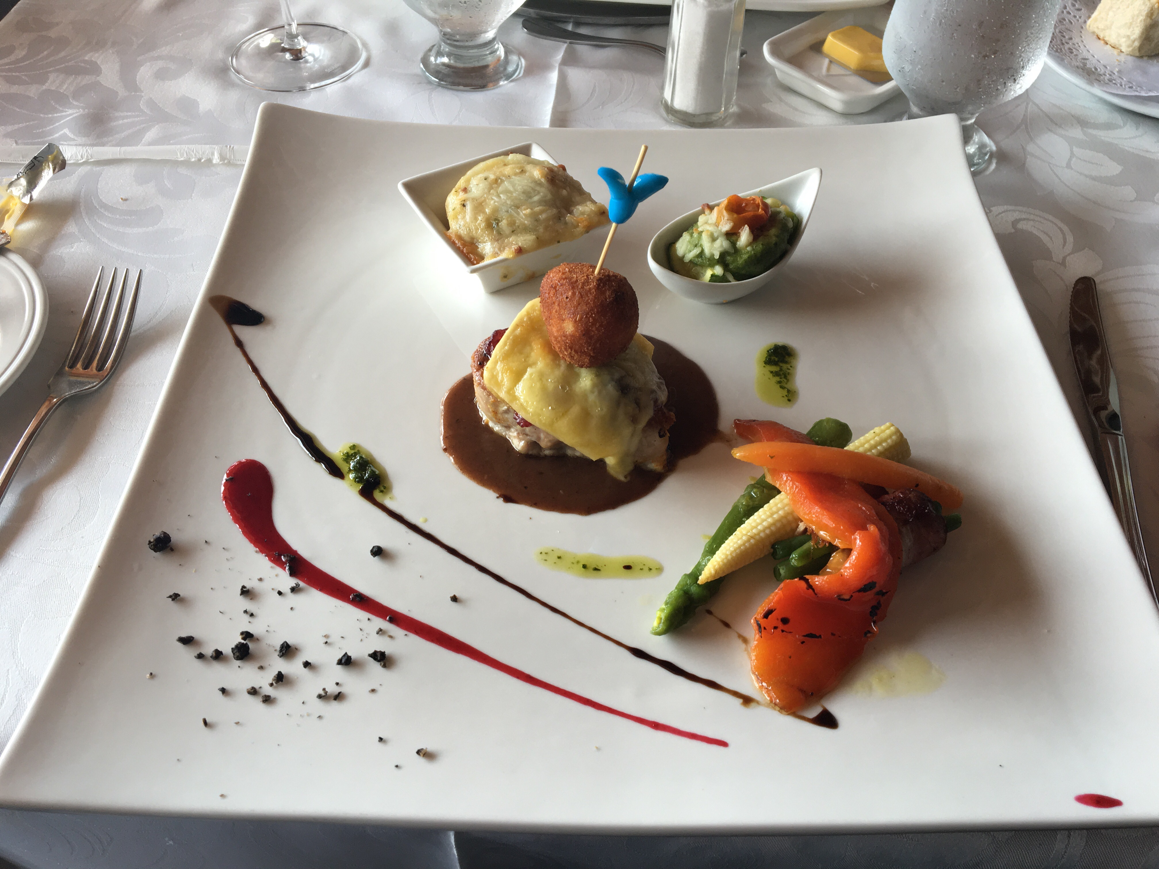 Lomito de Ternera al Gratin de Arándanos: Si hasta ahora no se ha convencido de los platos de esta reseña, este sin duda logrará el objetivo. Un corte de ternera, con la salsa de arándanos y un queso suizo derretido coronado con una croqueta de yuca. Todo esto sobre una demiglace hecha con el esmero de un cocinero experto. También presente los vegetales salteados con aceite extra virgen, acompañándose con las guarniciones de papa rellena gratinada y el mousse de brocoli.