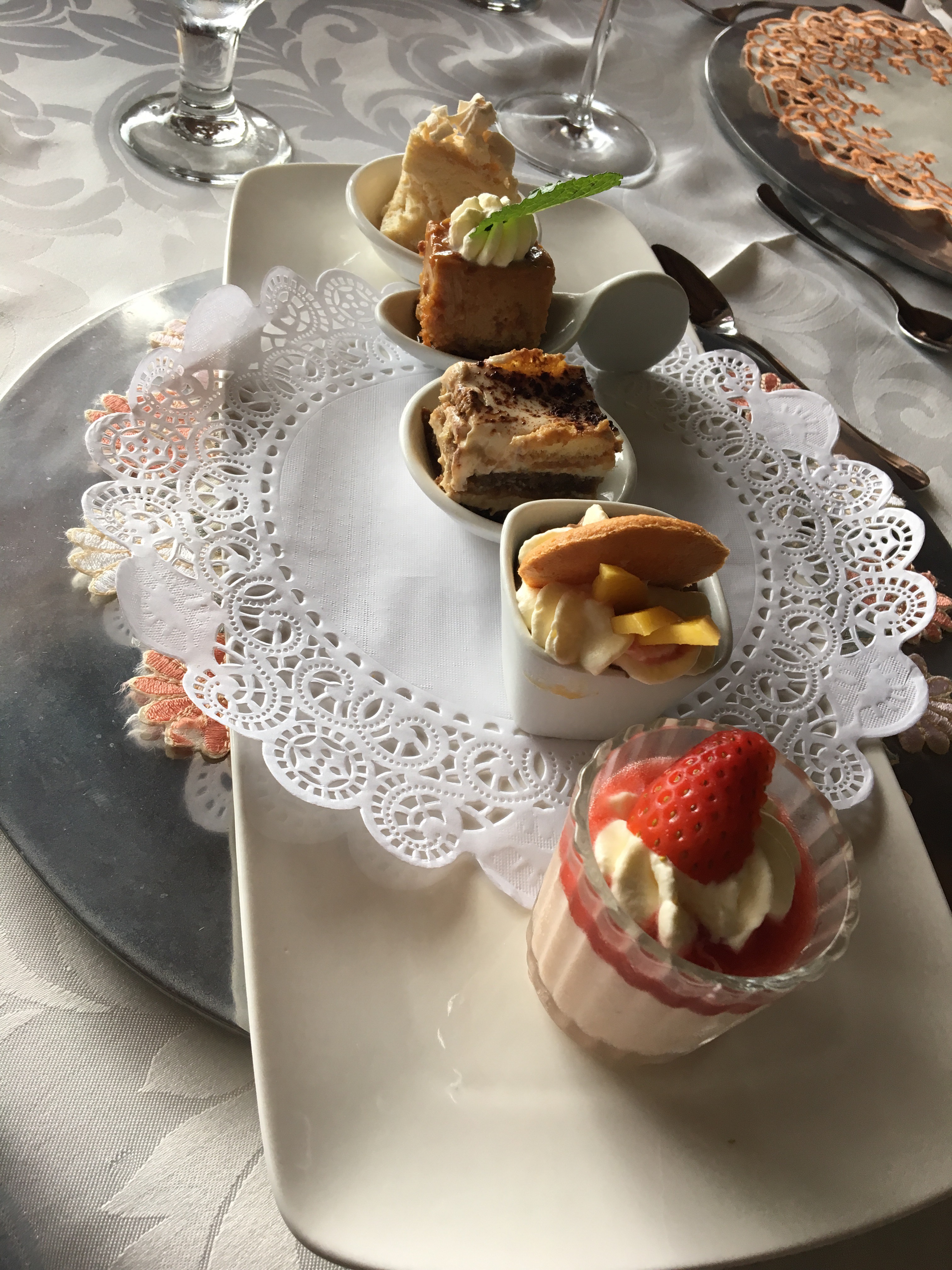 Selección de Postres de la Casa: Un final inesperado, sorpresivo y de hacer alarde de algo fuera de serie. Unas rocas de Amaretto, Flan de Coco y Tiramisú, como si fuera poco, un mousse de chocolate suizo 70% y un Bavaroise de Fresas.