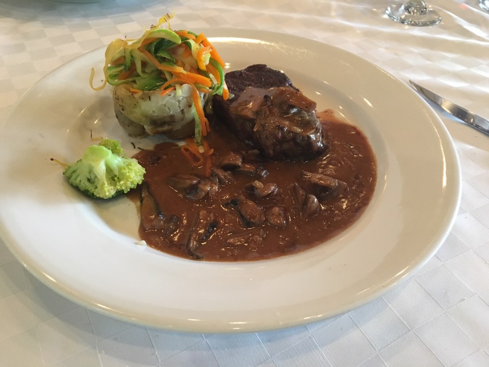 Lomito Richelieu con Champiñones y Trufa al Oporto. Monumental y de grandes atributos, una salsa hecha a partir de un buen caldo más las notas de trufas y Oporto que bañaban la carne tres cuadros cocimiento. Siempre le acompañan unos vegetales. Para repetir ese plato una y otra vez.