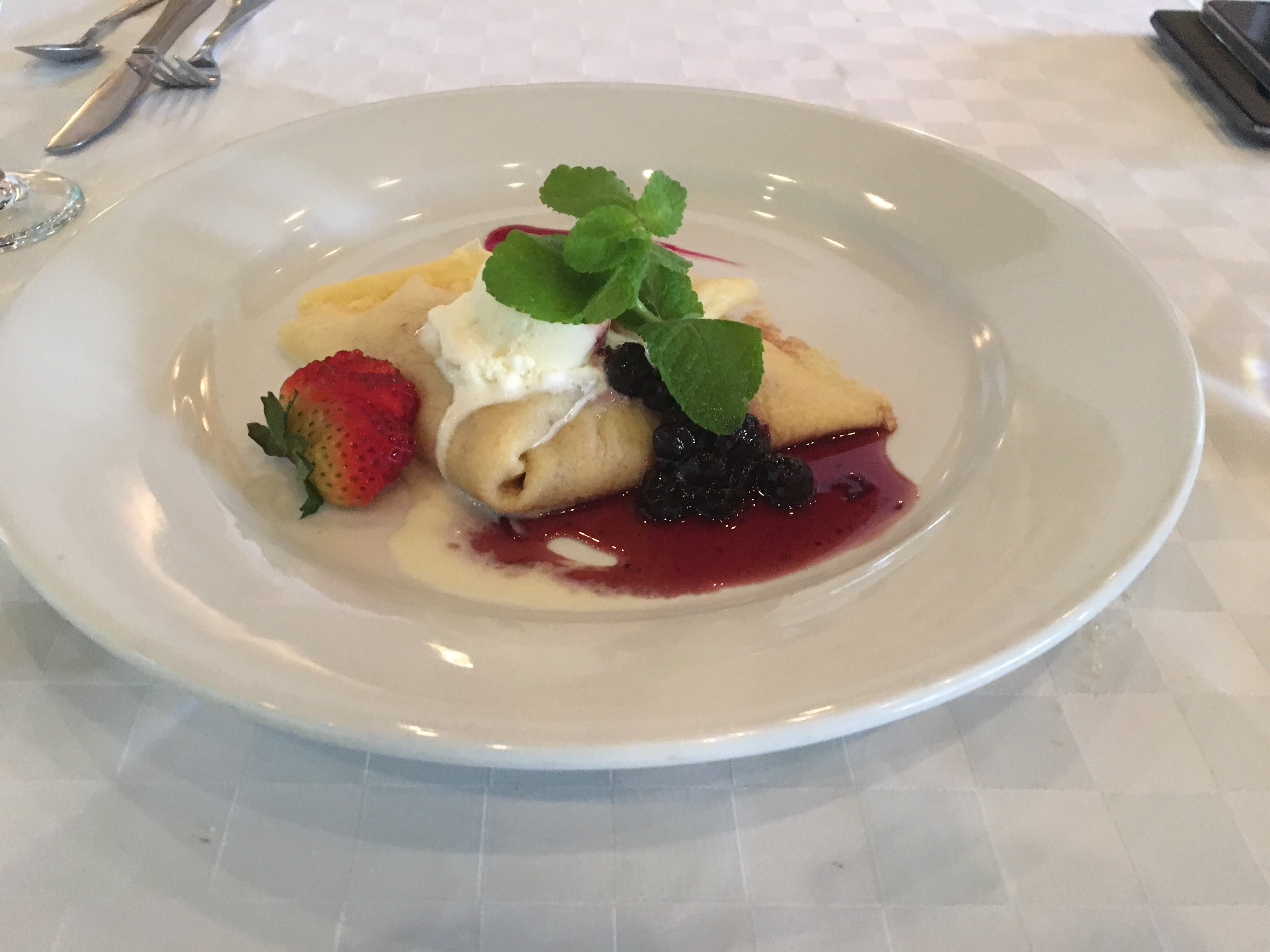 Crepe de Banano y Arándanos Unas bolas de helado de vainilla acompañaban ese postre que prometía y que cumplió las expectativas. Siempre es un buen final cuando de un buen postre se trata y aquí también lo fue.
