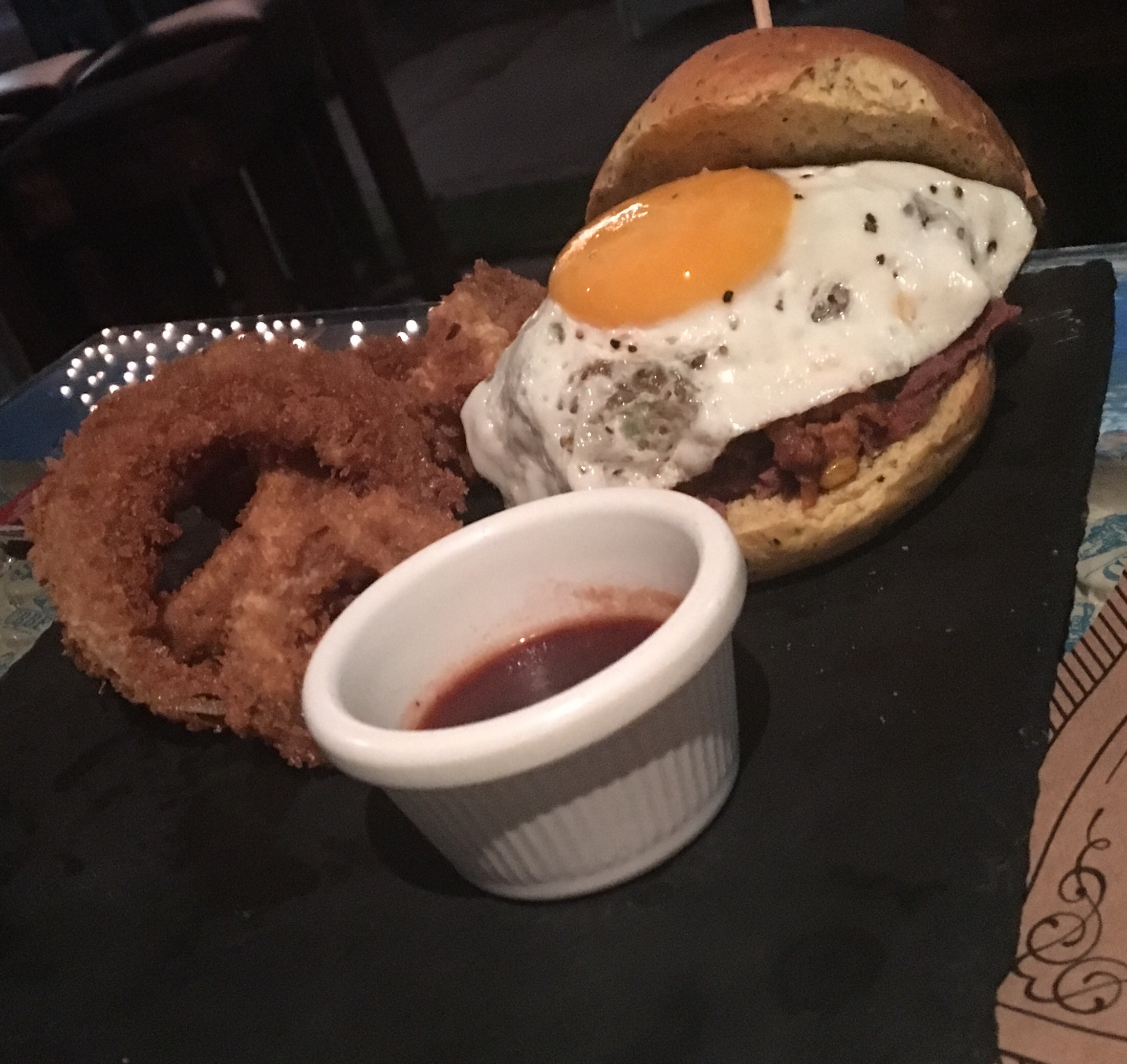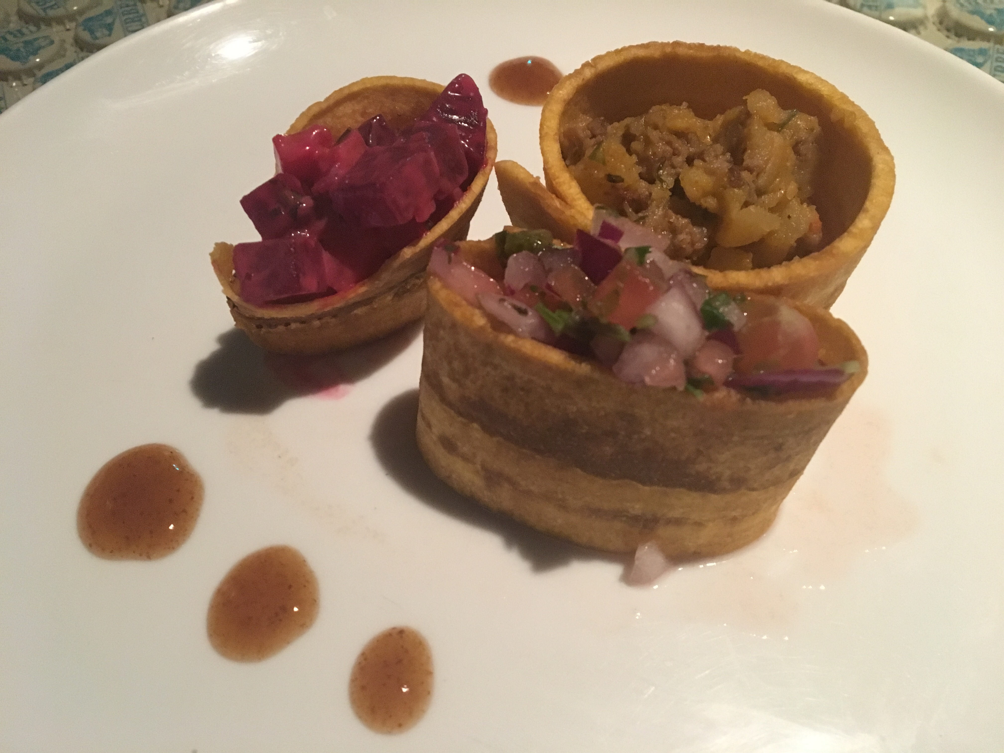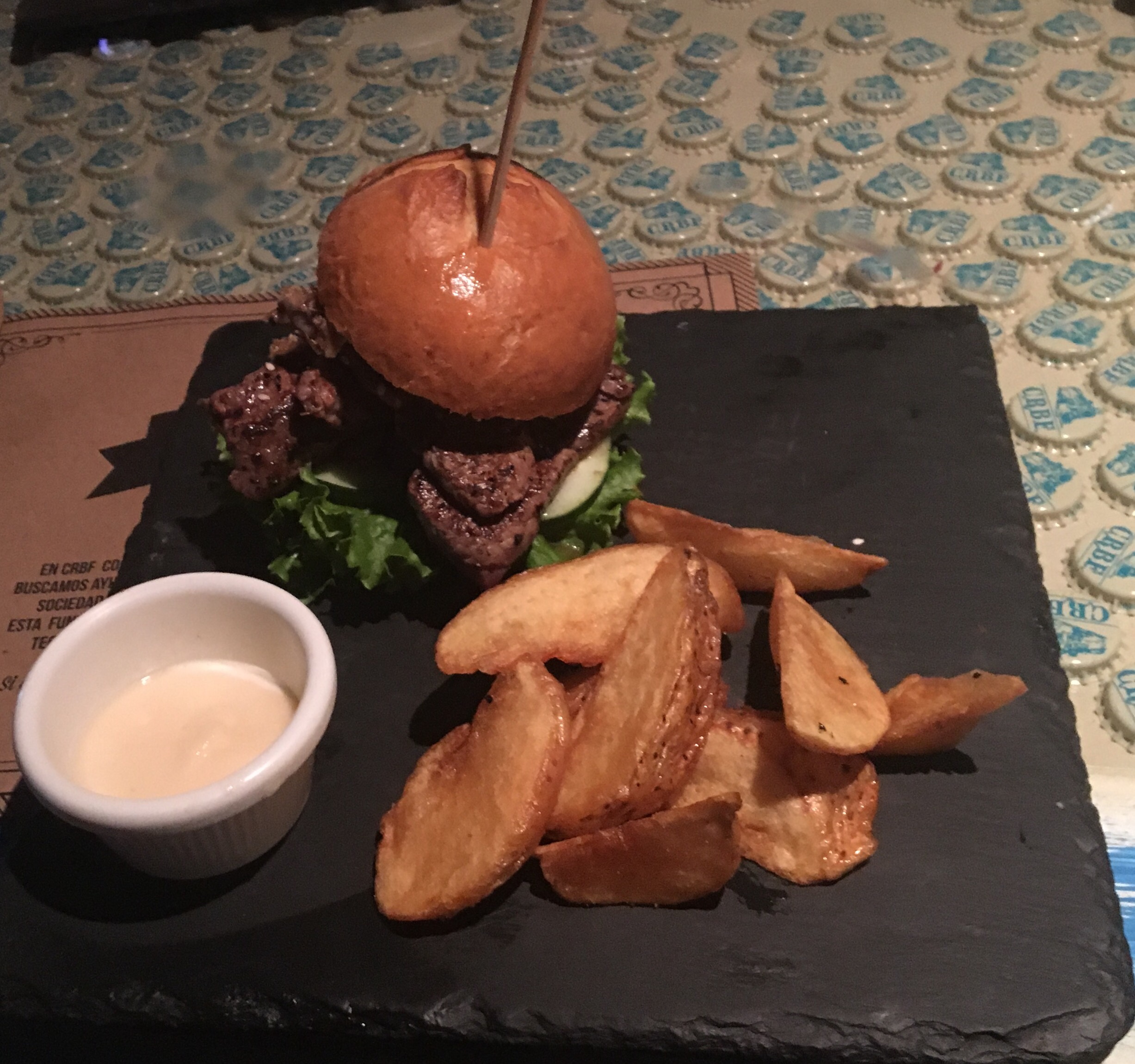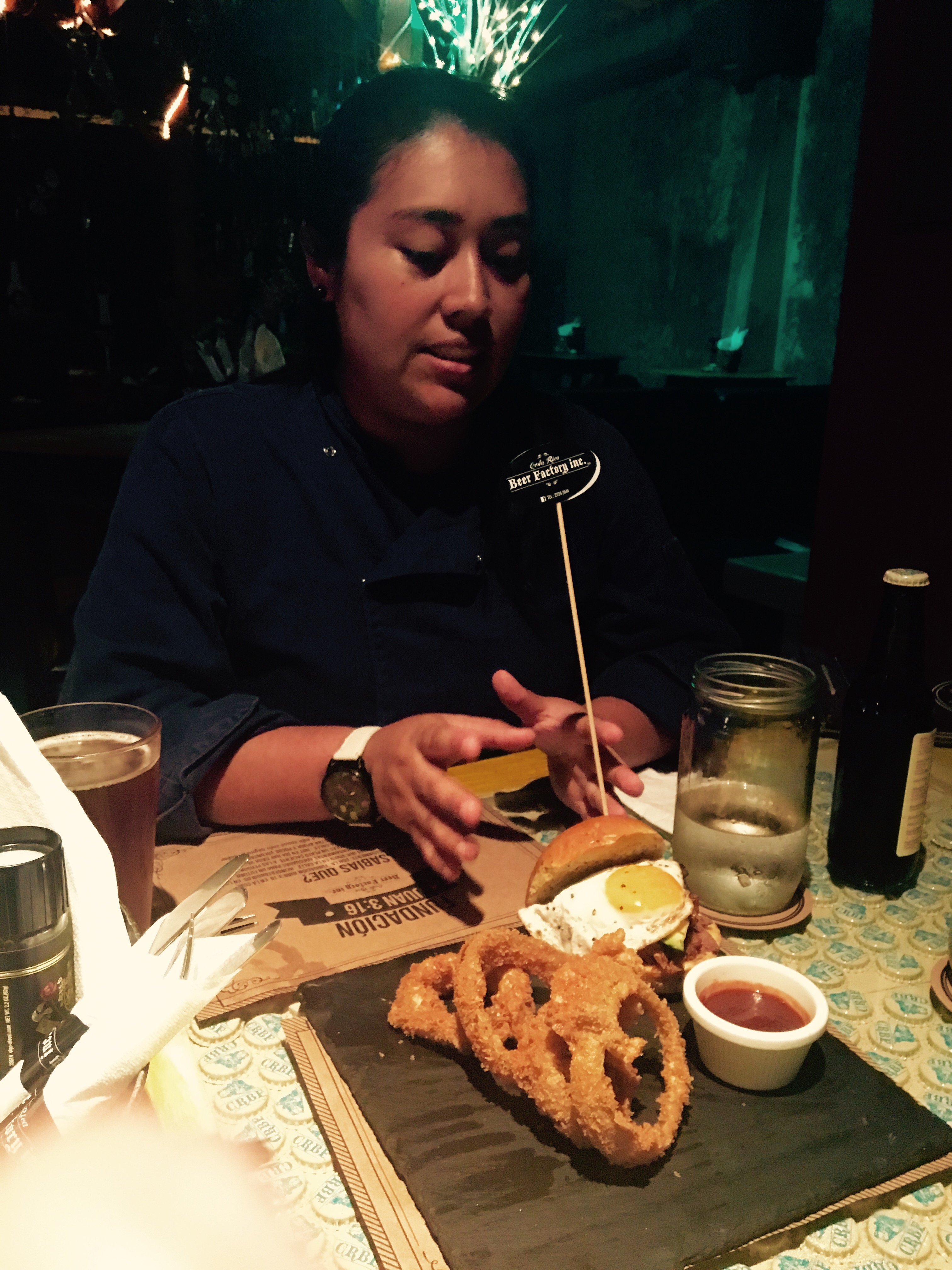 Los platos degustados fueron de gran factura, la hamburguesa umami fue servida en una elegante vajilla Revol y su alioli a base de ajonjolí proveía un sabor único y auténtico, que junto a la cerveza Escalante, hecha en dicho lugar, constituía en el elemento diferenciado.Los placeres de una hamburguesa con sabores costarricenses, son literalmente unos placeres ya que desde una carne de costilla de credo y salsa Lizano, junto a unos imperdibles frijolitos molidos y un huevo frito en la cúspide daba el le resultado de algo extraordinario.