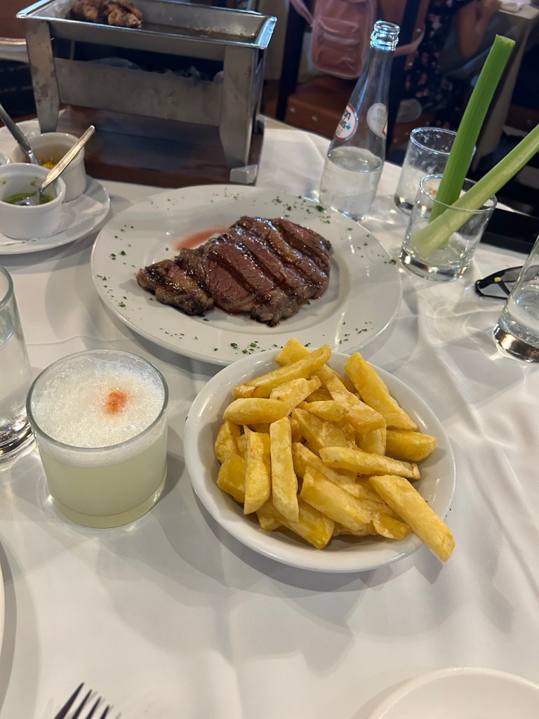 Guarniciones de Papas Fritas y Ensalada: Cómo olvidarse de que fue en el Perú de la época colonial donde se conoció ese tubérculo, popularizándose después en Europa? Obviamente preparadas en la cocina y provenientes de las zonas productoras, con una intensidad de color y sabor, que hacen la compañía necesaria para estos manjares de carne que nos hemos dado… oye y la ensalada? Pues igual, ya que con la palta que crece en Perú, no me hace falta el aguacate mexicano… de gran deleite estos manjares.