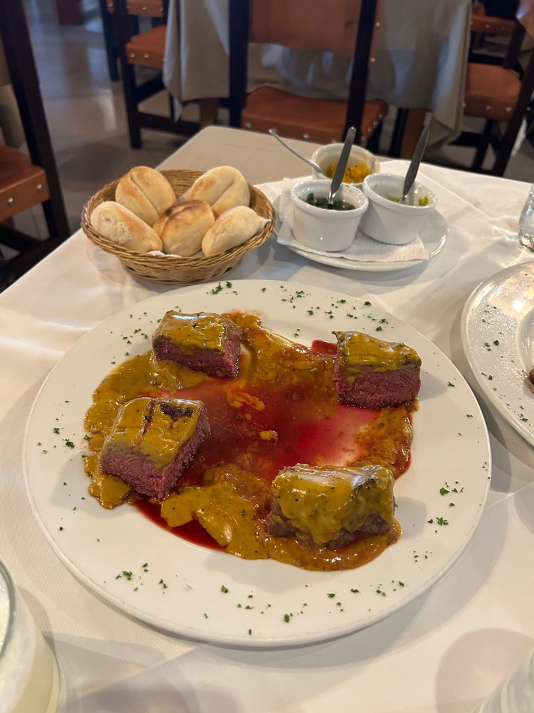 Mollejas de Res: De esas especialidades de la casa, un platillo que nunca había yo probado y me ha dejado un especial recuerdo para la posteridad. Cocinadas primero en salmueras por unos cuantos minutos, para obtener la costra que al ponerse en la parrilla, obtiene esa gran combinación de textura y sabor